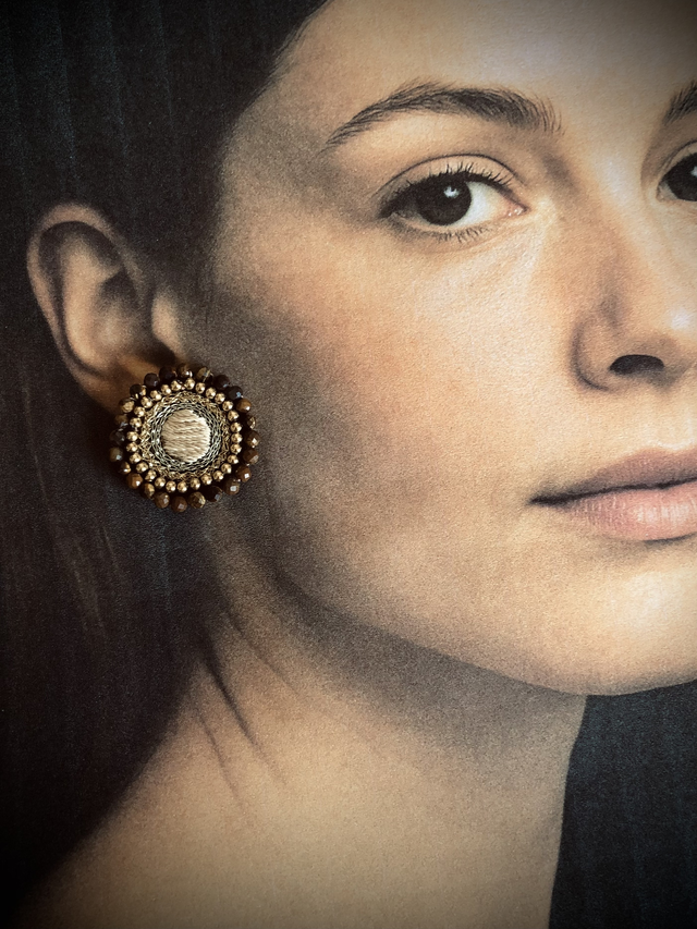 Les boucles d'oreilles Dharma L aux reflets dorés sont entièrement brodées à la main, en France, au sein du Studio.